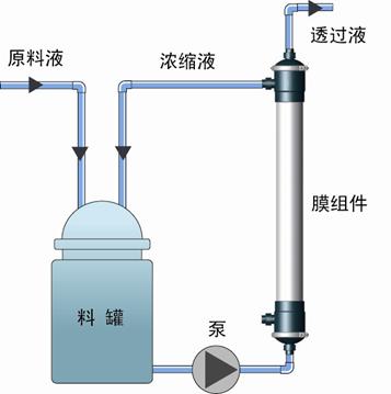 膜分离的基本工艺原理是较为简单的(参见右图)。在过滤过程中料液通过泵的加压,料液以一定流速沿着滤膜的表面流过,大于膜截留分子量的物质分子不透过膜流回料罐,小于膜截留分子量的物质或分子透过膜,形成透析液。故膜系统都有两个出口,一是回流液(浓缩液)出口,另一是透析液出口。在单位时间(Hr)单位膜面积(m2)透析液流出的量(L)称为膜通量(LMH),即过滤速度。影响膜通量的因素有:温度、压力、固含量(TDS)、离子浓度、黏度等。